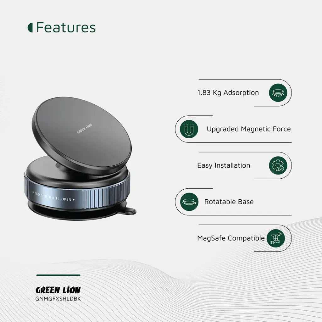 The Green Lion Magno Flex Vacuum Suction Holder is versatile and reliable; one can securely hold his devices. It is made of durable ABS, PC, and TPU materials and is designed for everyday use. Featuring 10 powerful N52 magnets, this holder offers upgraded magnetic force, boasting an impressive adsorption force of 1.83kg. The strong sucker provides a firm grip, having an adjustable adsorption pressure within the range of 18kPa to 65kPa for stability on various surfaces. Equipped with a 360° rotatable base, you can adjust your device to the best angle for view with ease. Easy to install, this is a convenient accessory for cars, homes, or offices. Strong in its build and flexible in function, the Green Lion Magno Flex Vacuum Suction Holder holds your device safely and within reach at any position.